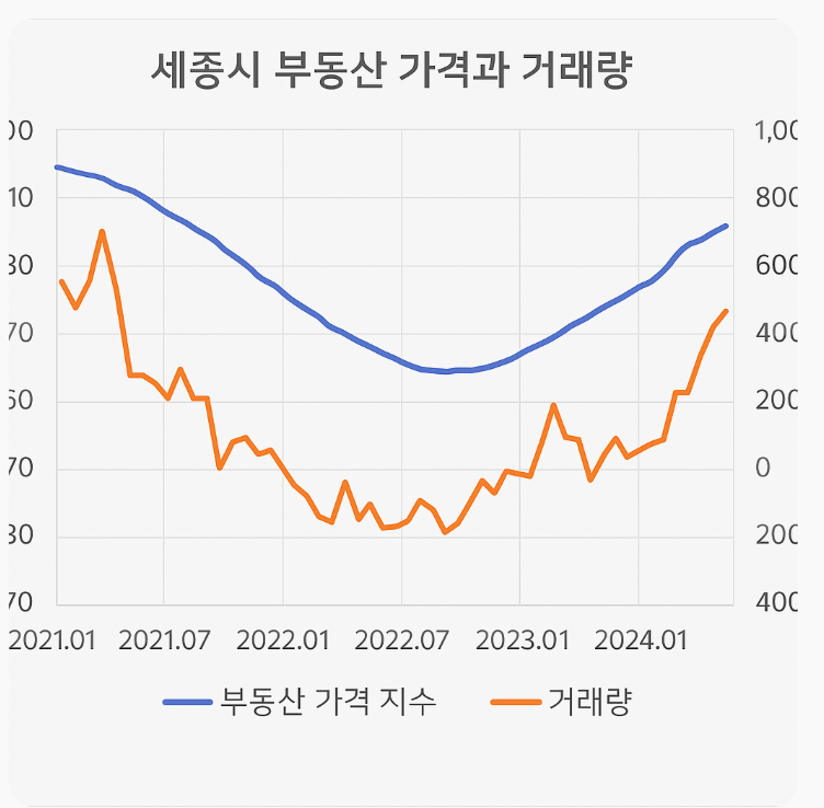 또한, 아래 그래프는 세종시 내 최근 5년간 부동산 가격 상승률과 거래량 변화를 보여줍니다.